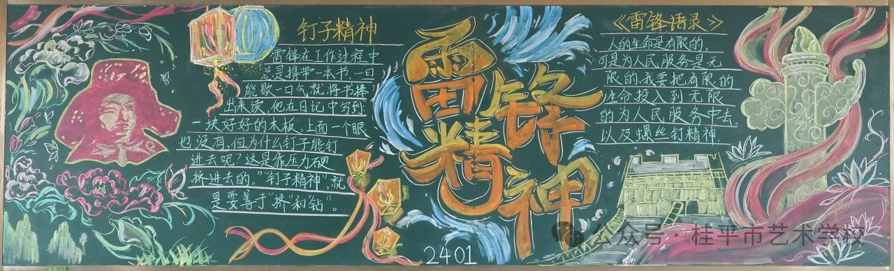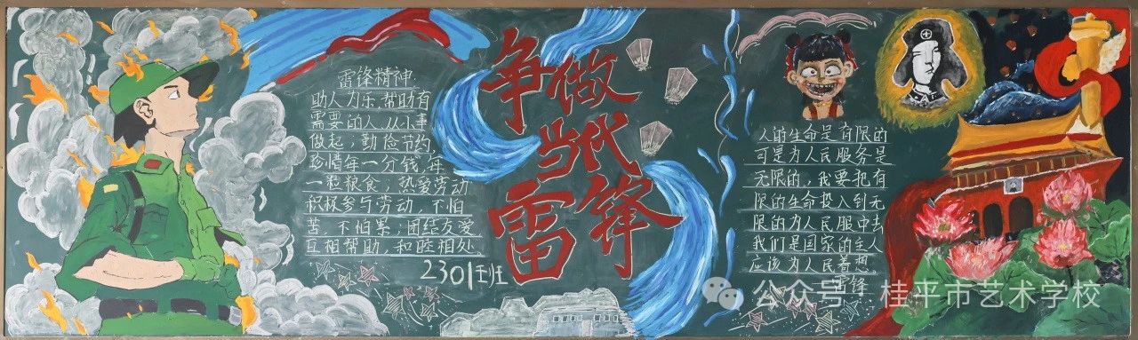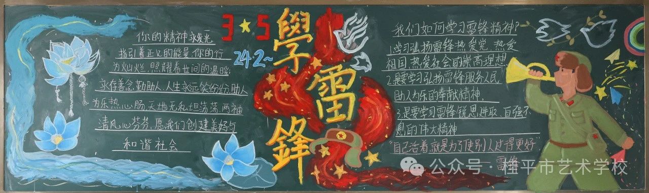 黑板报绘初心——各班级以黑板报为创作阵地,用粉笔勾勒雷锋形象、书写雷锋语录,让教室墙面成为传承精神的无声课堂;