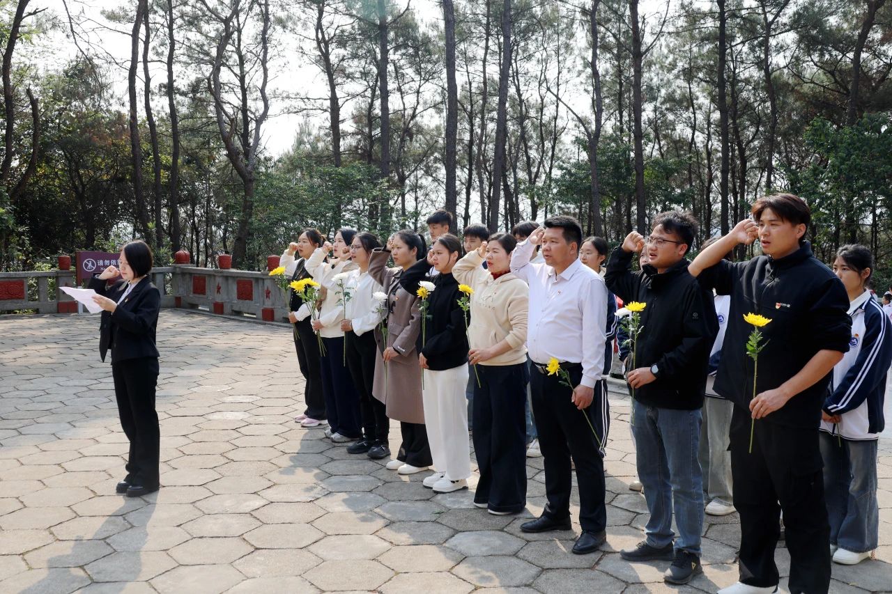 在庄重的氛围中,张毅书记发表讲话,深情回顾了革命先烈黄日葵、胡福田的光荣事迹。黄日葵作为广西最早的共产党员之一,以笔为枪唤醒民族觉醒;胡福田在血雨腥风中坚守信仰,用生命诠释忠诚担当。一段段动情讲述,让历史的烽烟穿越时空,红色火种在青年心中炽热燃烧。