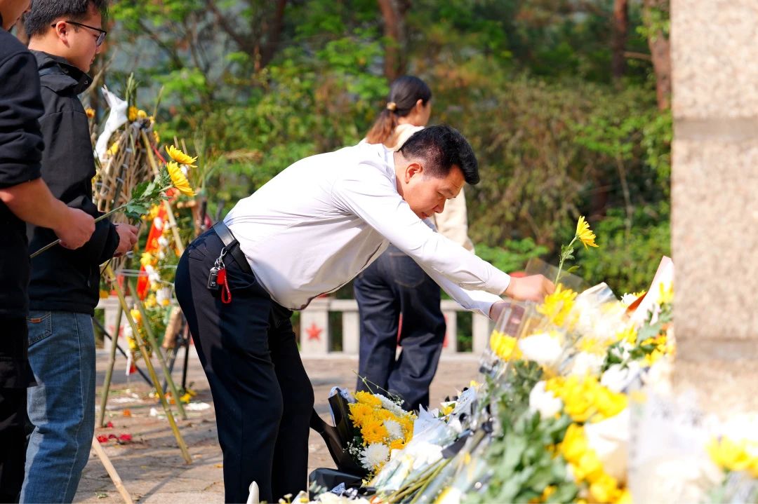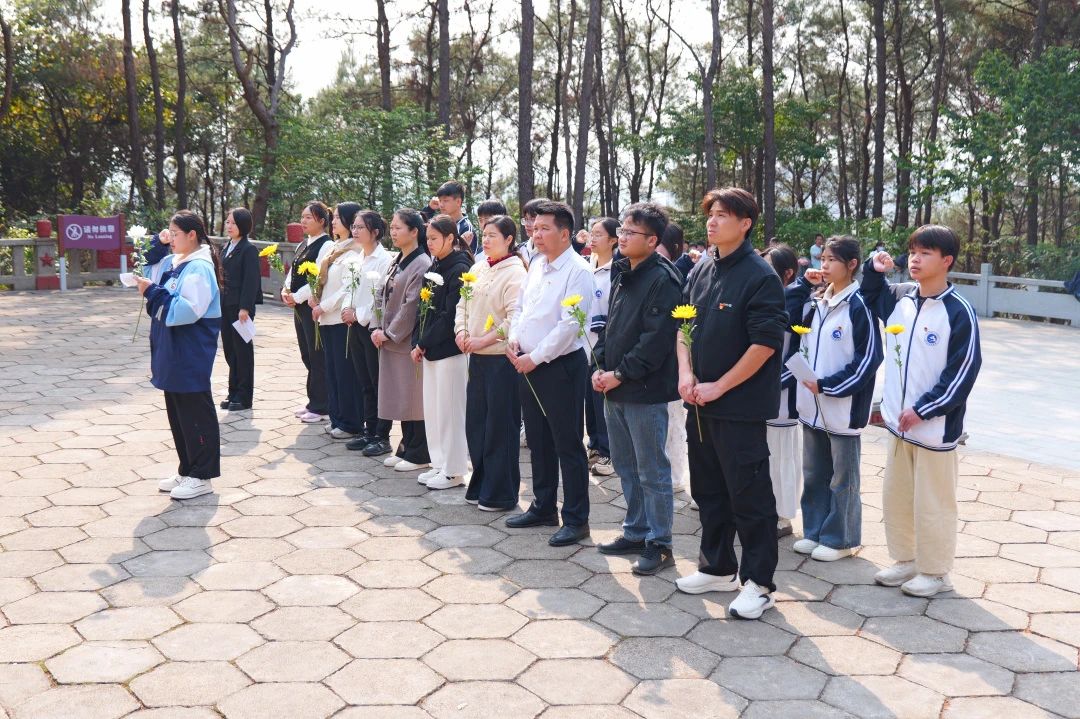 活动由党支部书记张毅主持。青山巍巍,松柏苍翠,两名学生代表迈着坚定而又沉重的步伐,缓缓走向纪念碑,向先烈敬献花圈。朵朵白菊寄托哀思,全体师生肃立凝视,以无声的注目礼传递对英雄的深切怀念与崇高敬意。