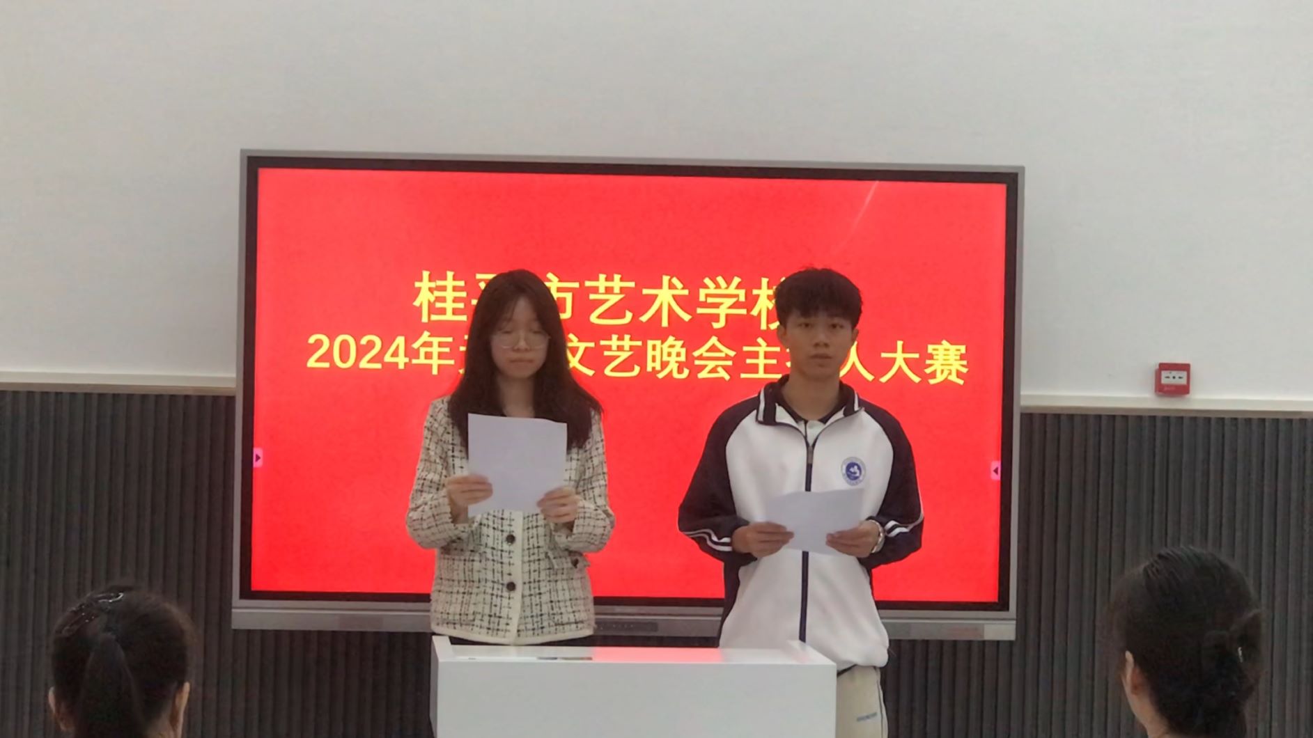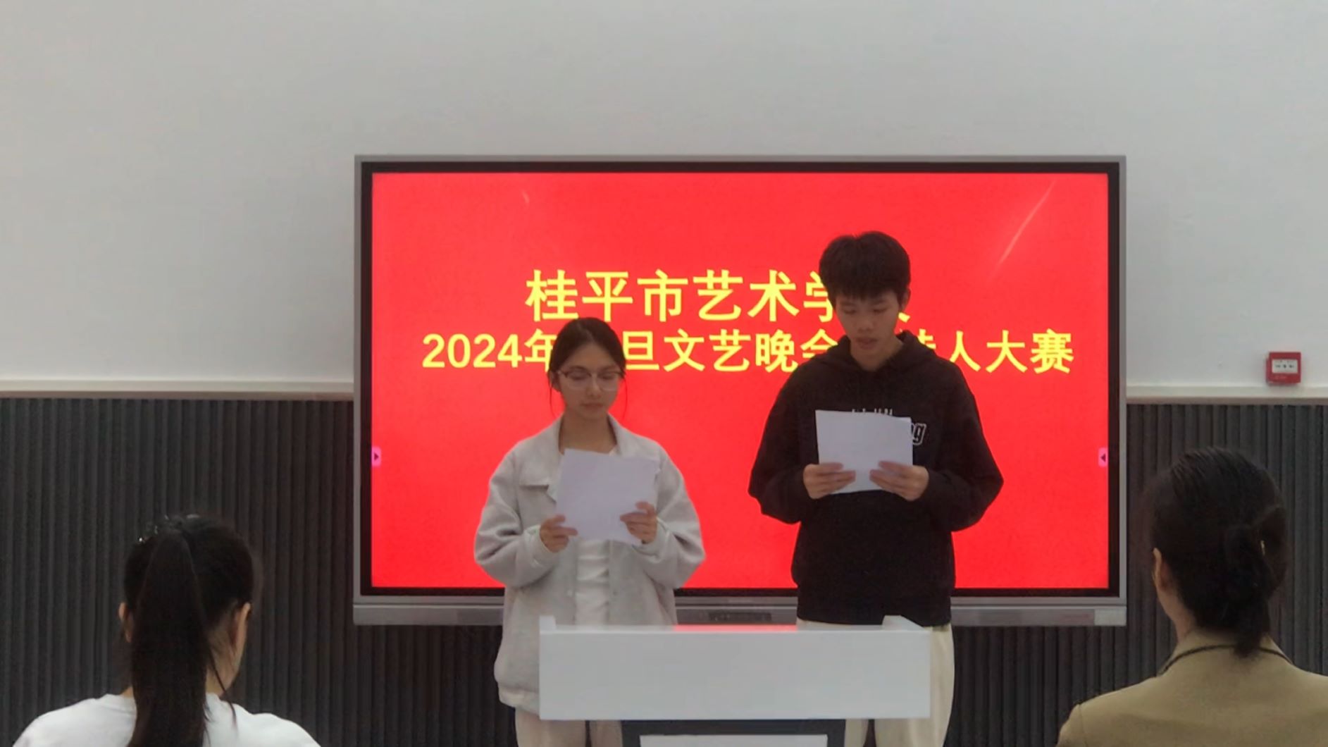 参赛者自行搭档,模拟主持。主要考察同学们的普通话是否达标,口语表达是否清晰达意,搭档主持过程中交流是否顺畅。
